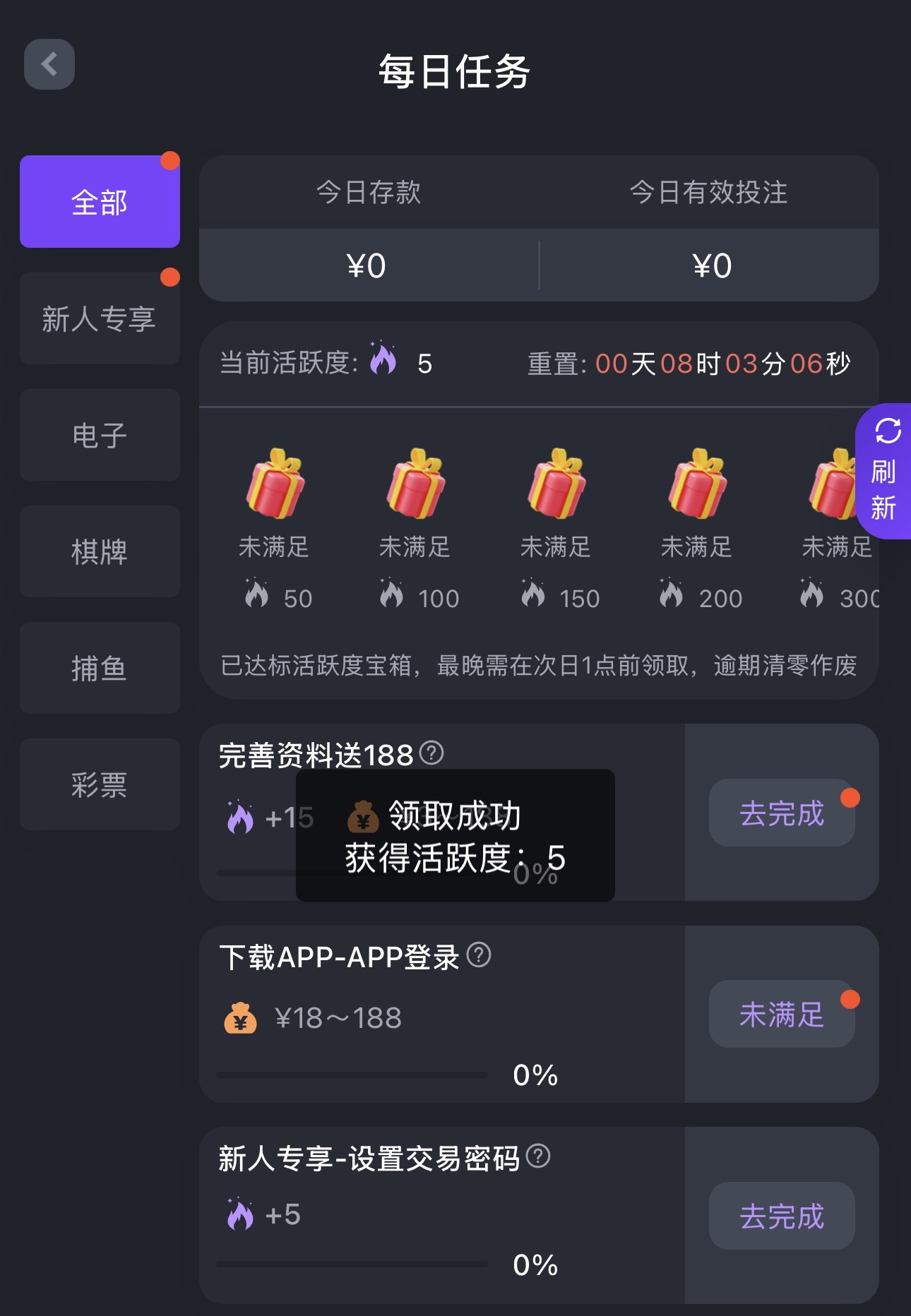 新用户注册绑卡完善所有资料,点击优惠-每日任务里面自助领取