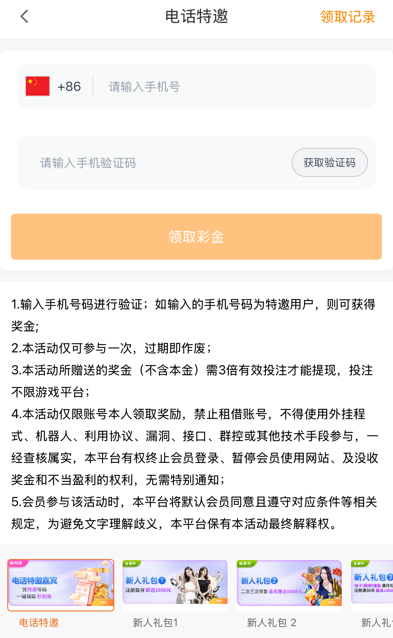 新用户注册绑卡点击优惠大厅里面的电话特邀自助验证手机号是特邀秒送